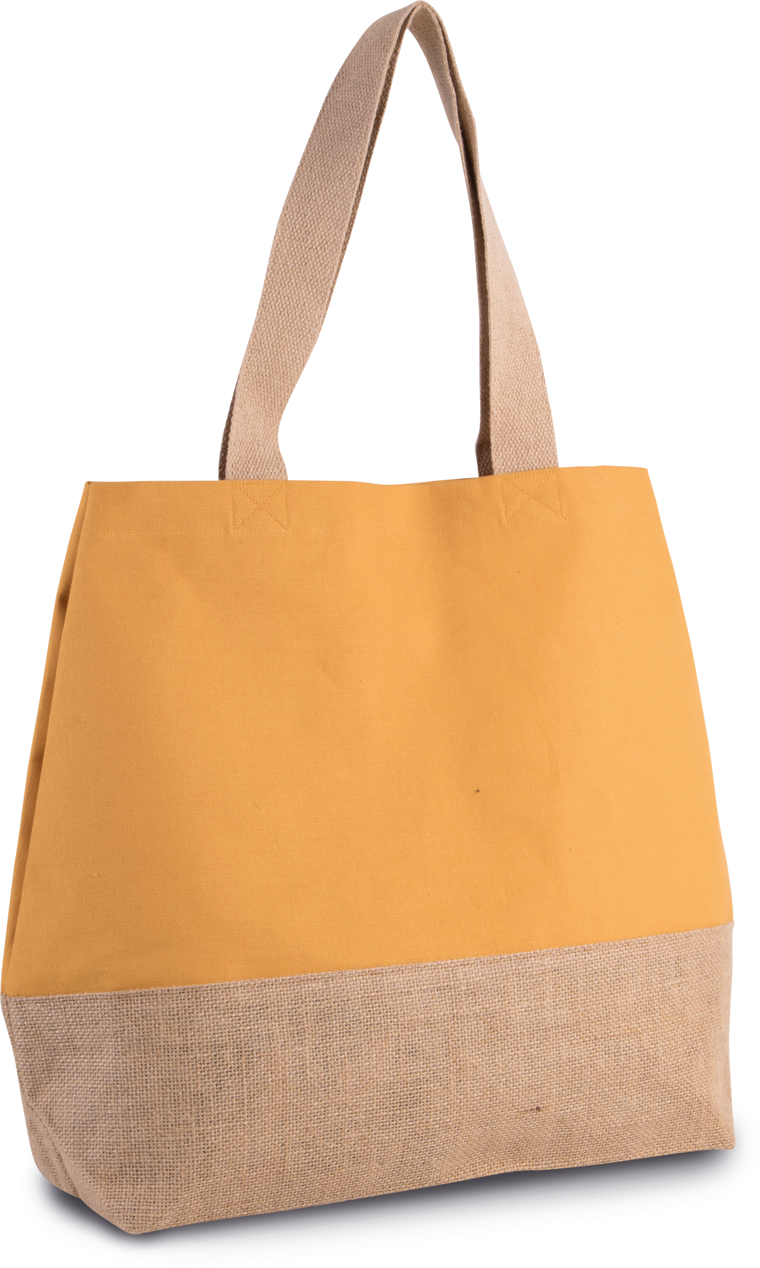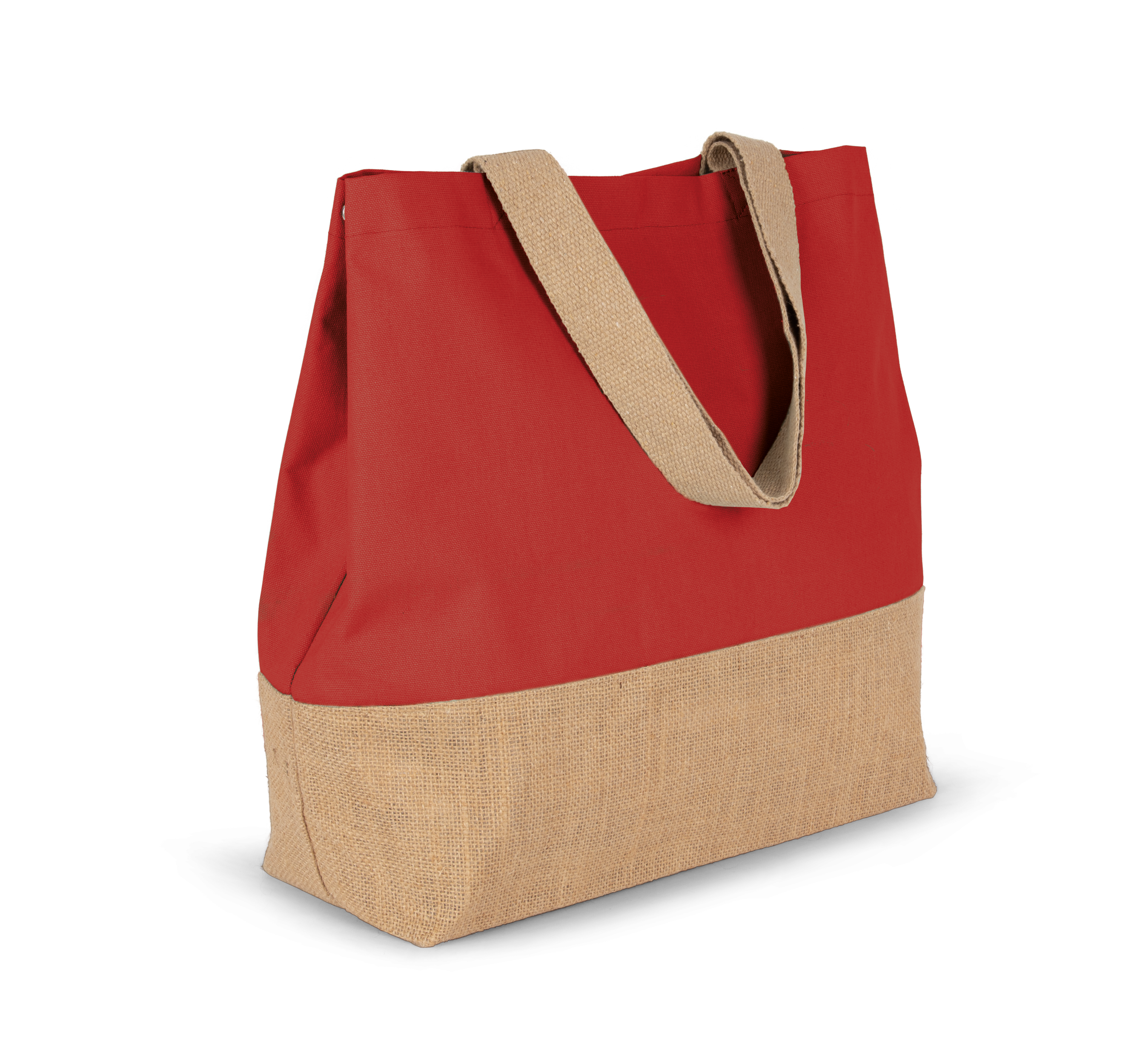 Vælg farveLarge hold-all cotton bag with constrast laminated natural jute base. Zipped inner pocket. Gusset. 55 cm cotton handles. Magnetic press stud fastening.
