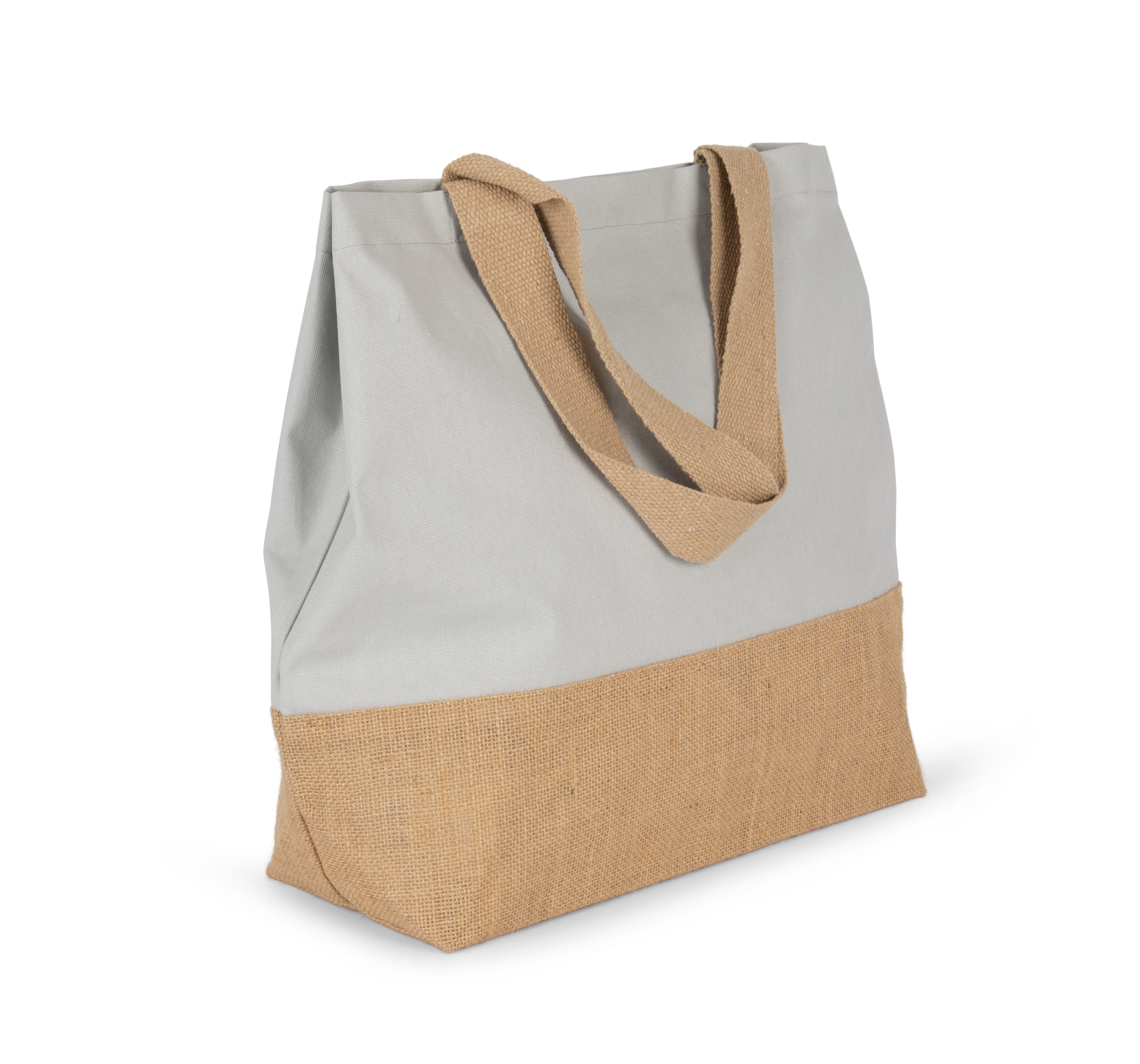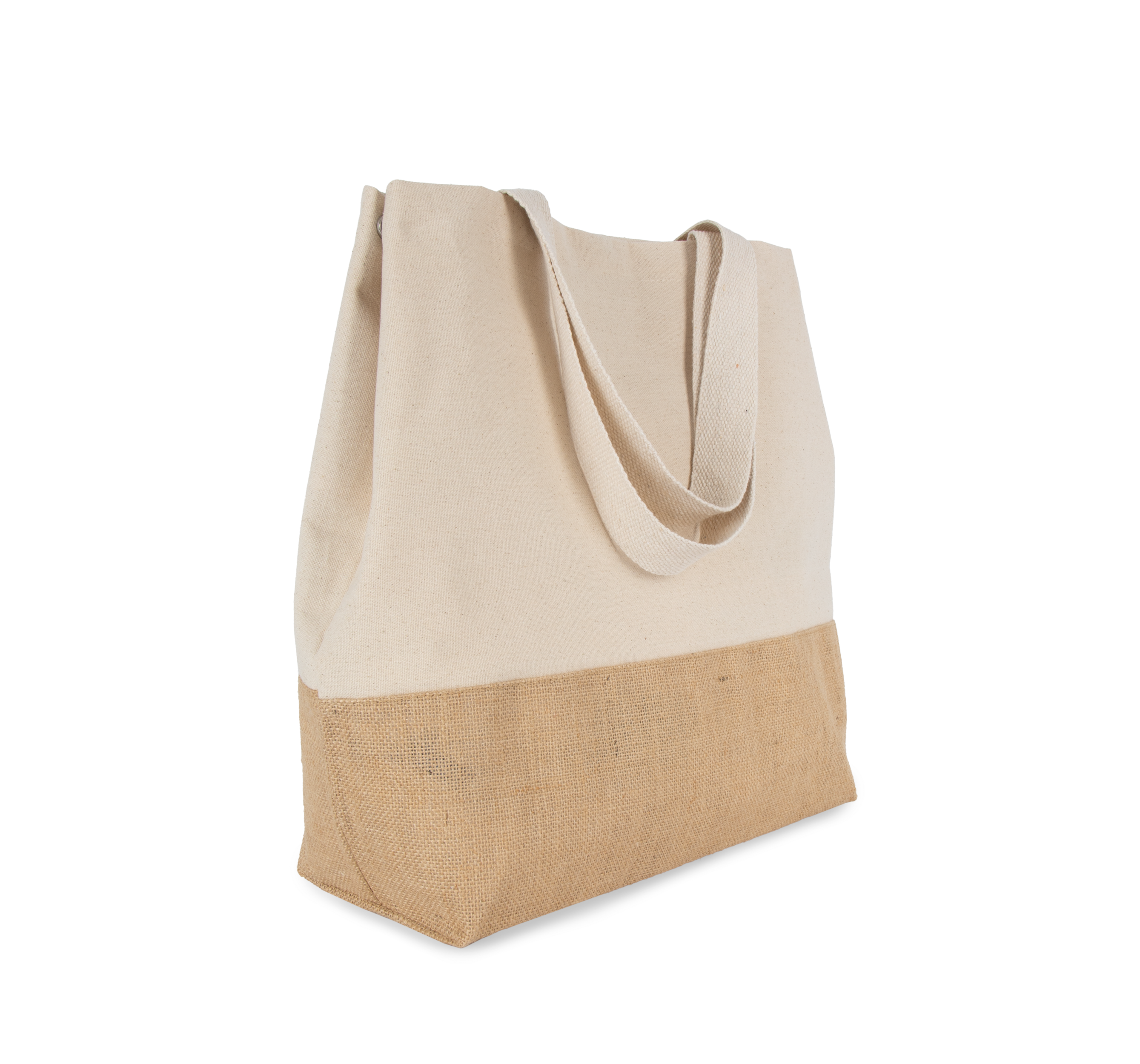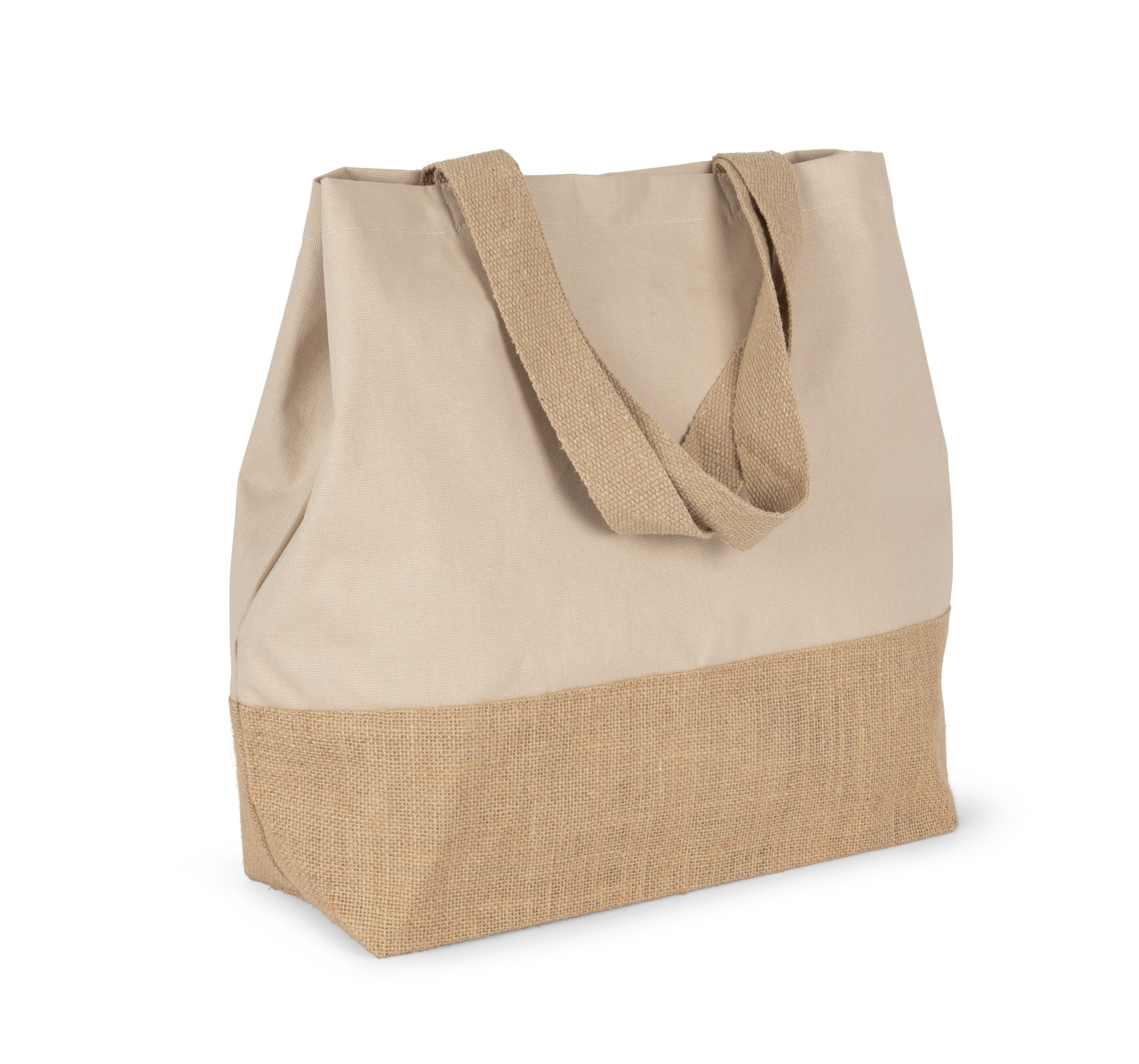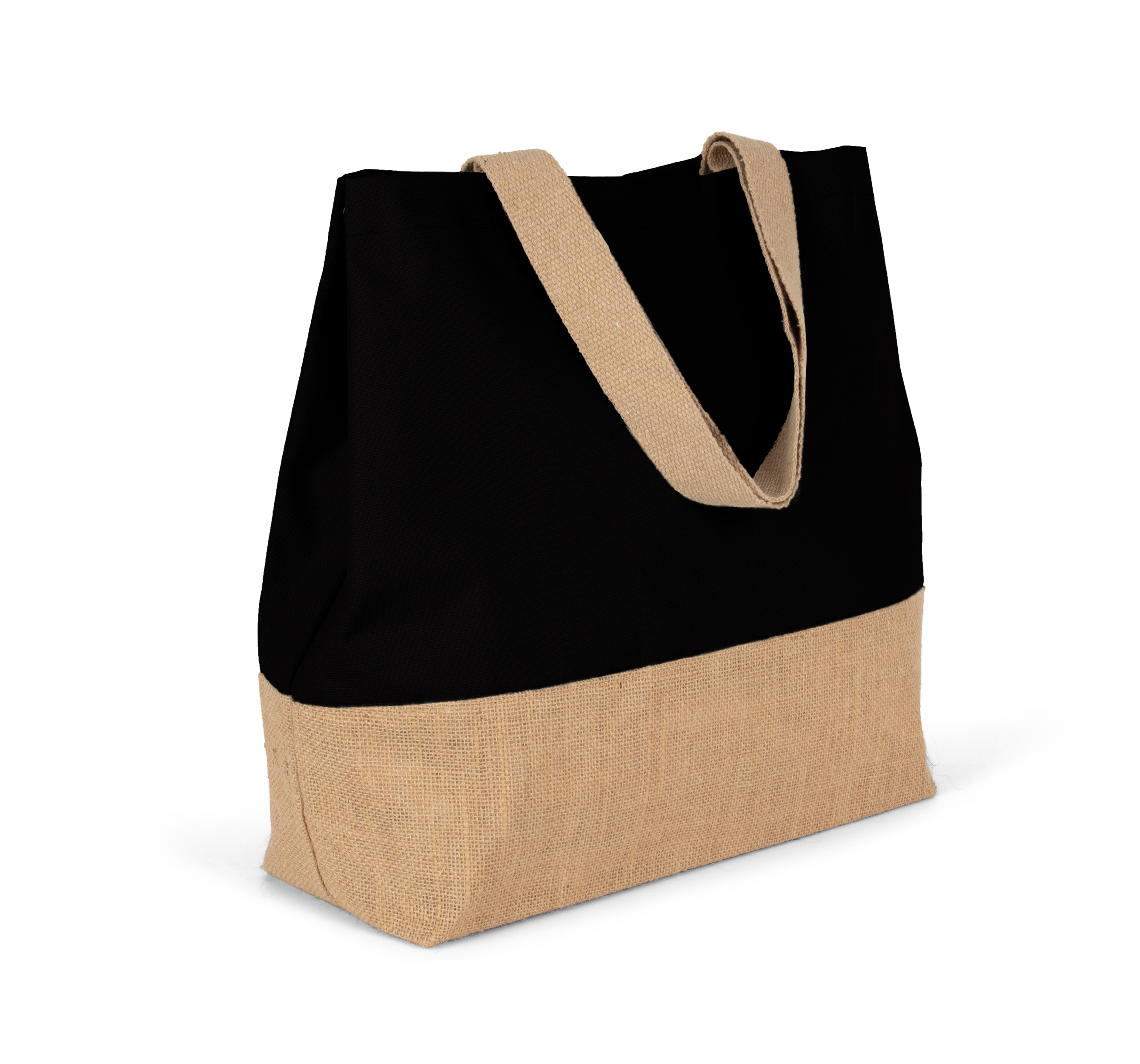 Large hold-all cotton bag with constrast laminated natural jute base. Zipped inner pocket. Gusset. 55 cm cotton handles. Magnetic press stud fastening.